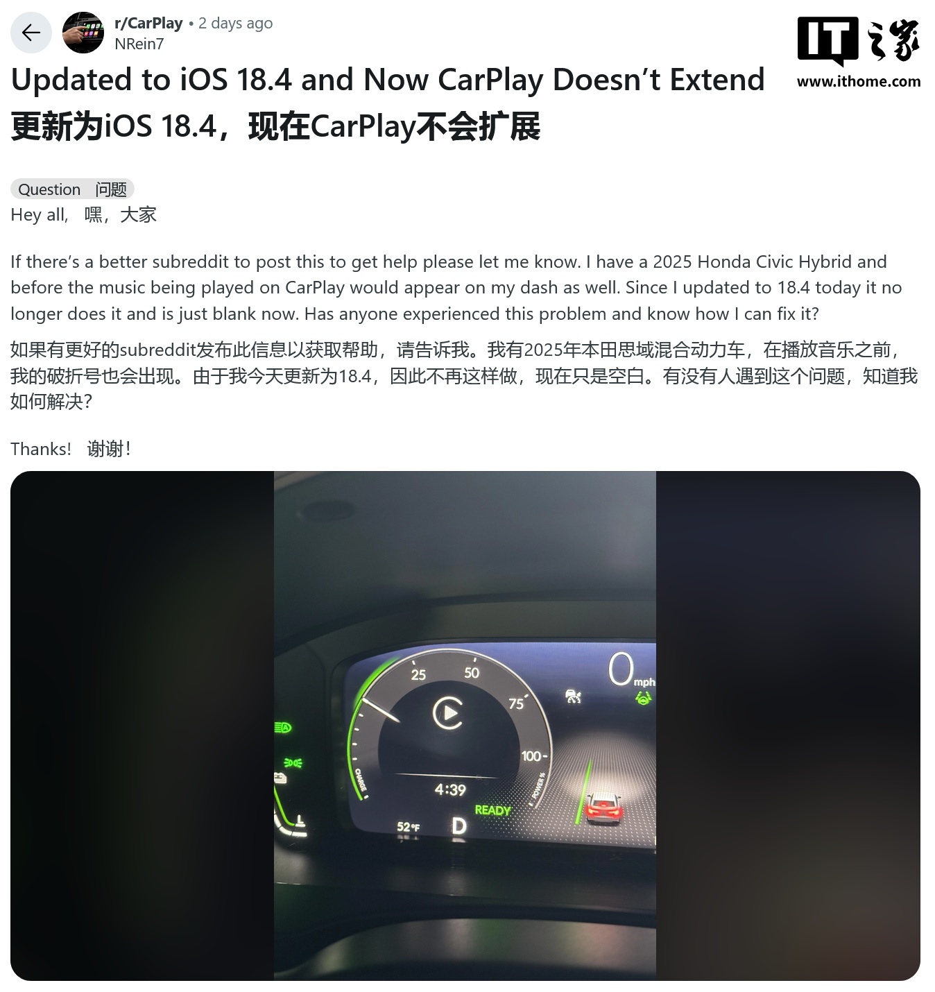 苹果 iOS 18.4 系统本周推送后,Reddit 等平台涌现大量投诉。用户升级后发现 CarPlay 出现多种故障,最普遍的问题是车载仪表盘无法同步显示音乐播放信息。IT之家附上截图如下:
