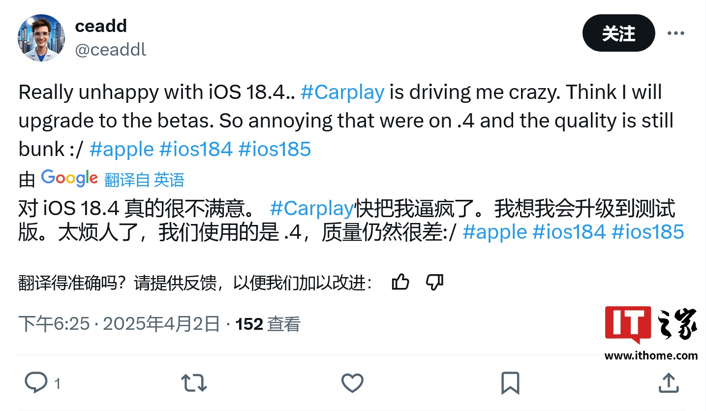IT之家 4 月 4 日消息,科技媒体 9to5Mac 昨日(4 月 3 日)发布博文,报道称部分 iPhone 用户反馈在升级到 iOS 18.4 更新后,导致 CarPlay 功能异常。具体表现为车载仪表盘无法显示“正在播放”信息、无线连接频繁断连,部分用户需反复插拔数据线或重启车辆才能恢复连接。