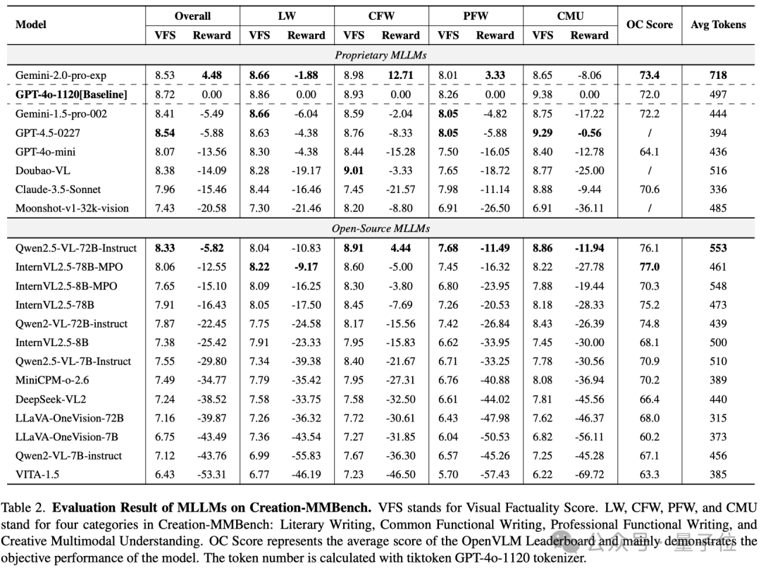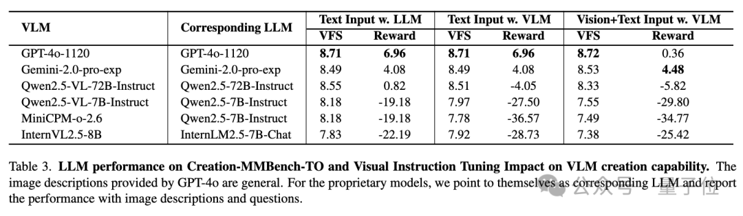 从纯语言模型的评测结果来看,闭源 LLM 的创作能力略优于开源的 LLMs,令人惊讶的是,GPT-4o 在 Creation-MMBench-TO 上的创意奖励分更高。这可能是因为该模型能够在描述的帮助下更专注于发散思维和自由创作,从而减少基本视觉内容理解对创造力的负面影响。