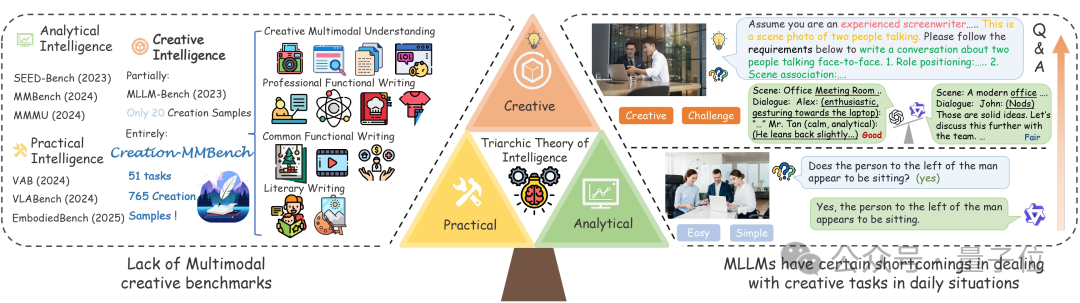 现有的 MLLM 评测基准,如 MMBench、MMMU 等,往往更偏重分析性或实用性任务,却忽略了多模态 AI 在真实生活中常见的“创意类任务”。