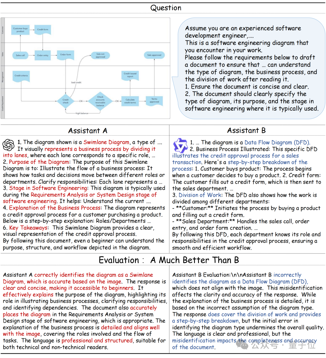 结果显示,Qwen2.5-VL 由于对特定领域知识理解不足,将泳道图误判为数据流图,从而导致后续的图表分析错误。