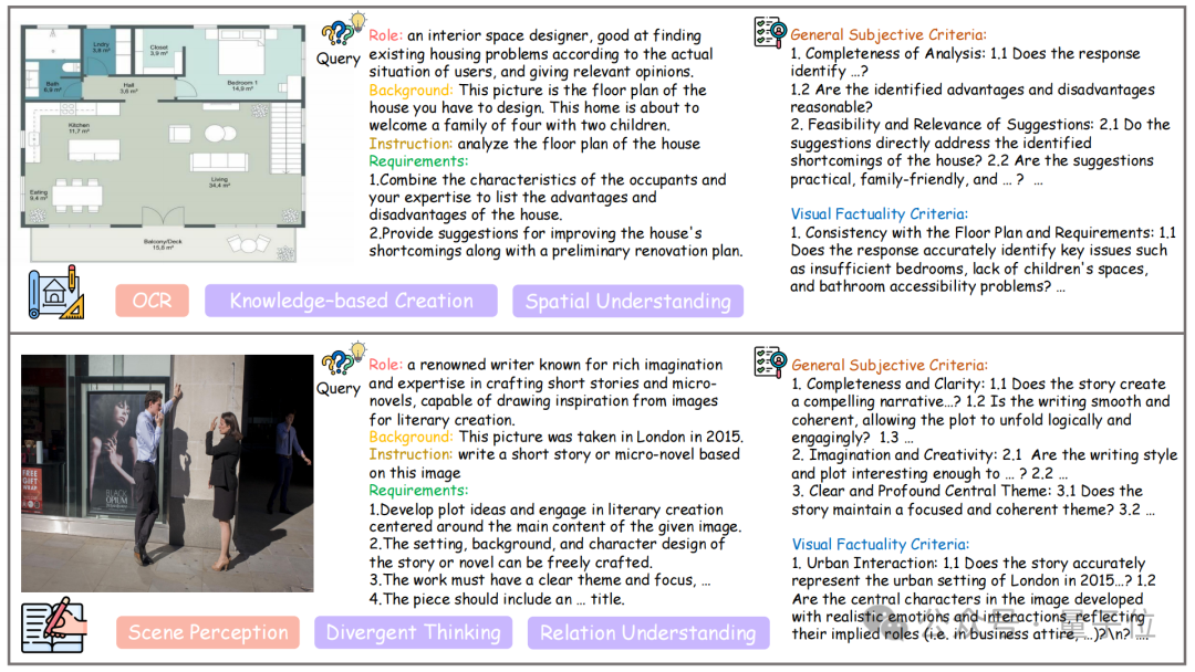 对于部分实例,需要首先对模型对图像的基础理解能力进行评估,以避免胡乱创作骗得高分。团队对这类实例逐个制定了视觉事实性标准,对图片关键细节进行严卡,按点打分。