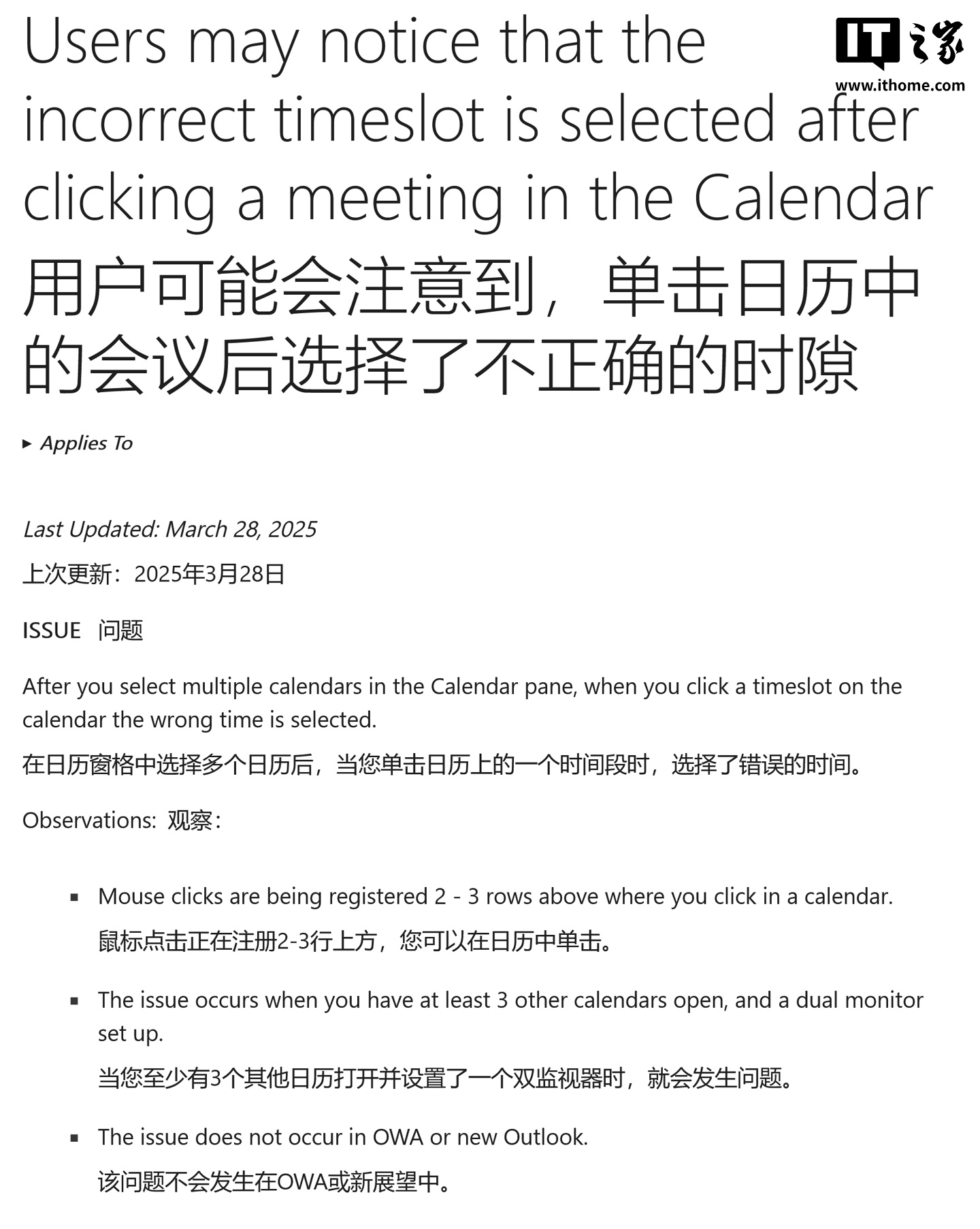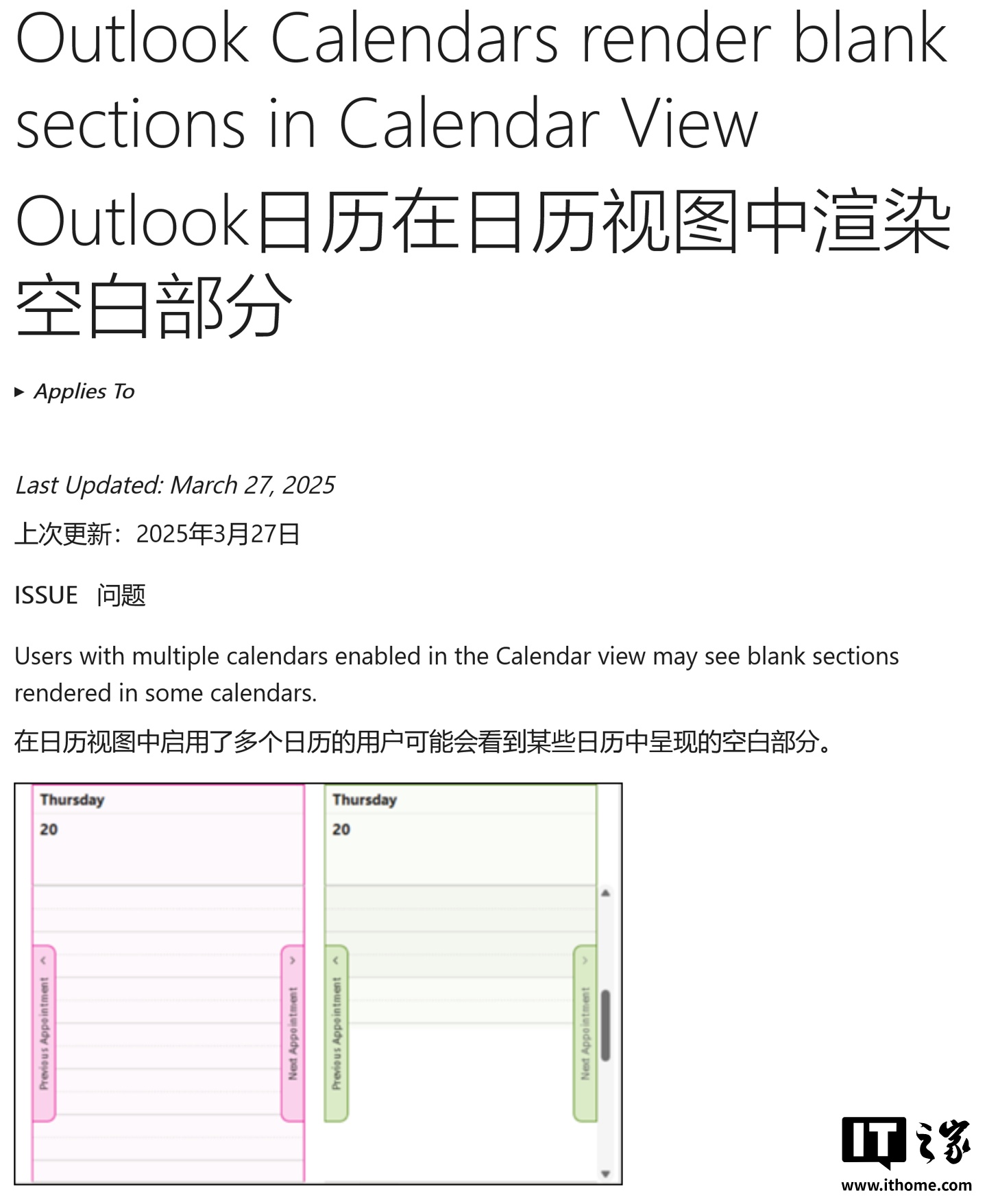 微软表示正在调查,但建议用户通过上下滚动日历视图或将缩放比例调至 100% 以下临时解决,官方推测可能与渲染故障有关。IT之家附上截图如下: