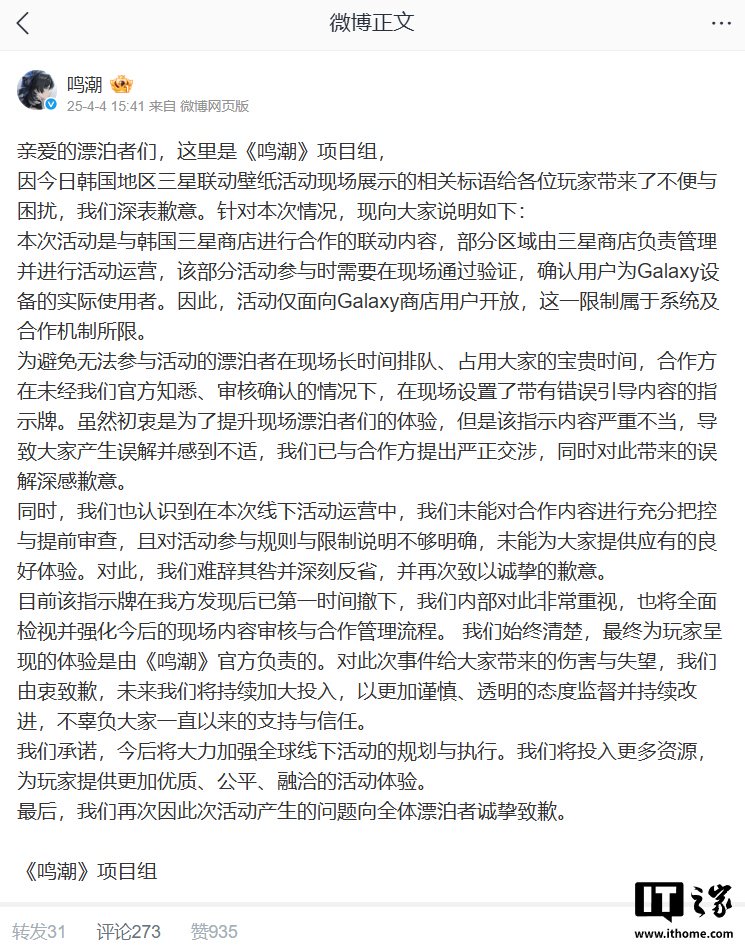 IT之家 4 月 4 日消息,今日有用户在小红书、微博、B站等平台发文称,《鸣潮》在韩国与三星 Galaxy 商店举行联动活动时摆出了一面用简体中文、英语写有“今天只有韩国人可以入场”的指示牌,引起热议。