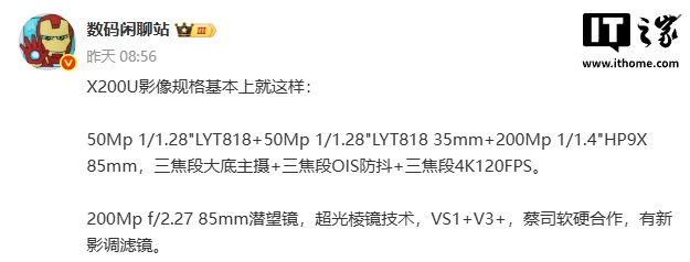 IT之家 4 月 4 日消息,vivo X200 Ultra 手机将于本月发布,博主 @数码闲聊站 现已曝光了这款新机的影像规格。