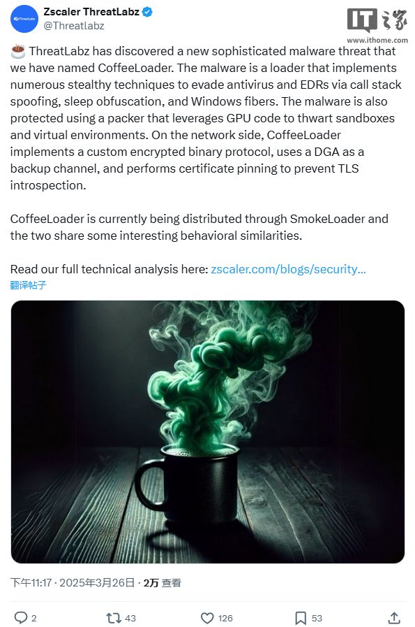 IT之家 4 月 4 日消息,网络安全公司 Zscaler 上周发现了一种新恶意软件并将其命名为 CoffeeLoader。研究发现该恶意软件最早可追溯至 2024 年 9 月,目前主要威胁华硕游戏本及台式机电脑用户。
