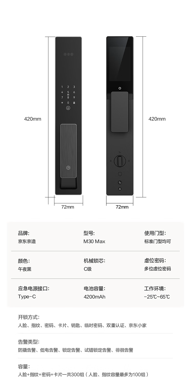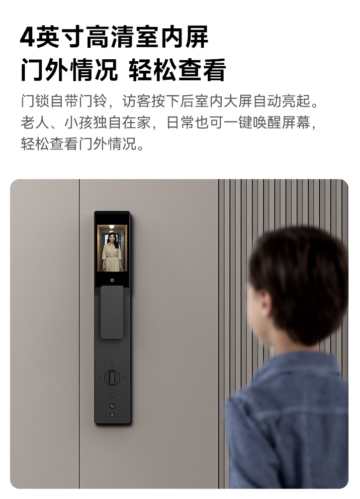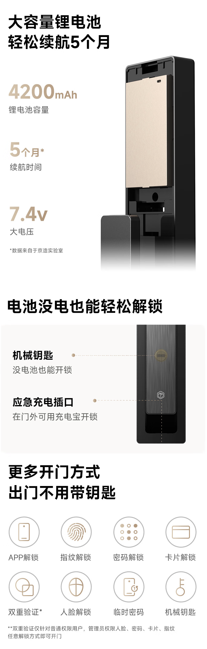 该门锁配备 4 英寸内屏,支持门外有人逗留时自动抓拍警告功能,门锁使用防卡死轻音锁体,为 C 级锁芯,配备 4200 毫安时电池,有效续航 5 个月,门锁配备 USB-C 应急充电接口。