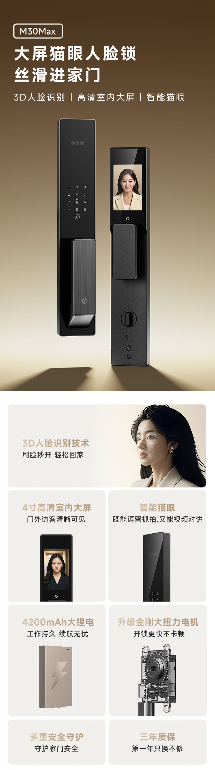 IT之家 4 月 5 日消息,京东京造旗下 M30 Max 智能门锁现已开启首销,这款门锁主打“3D 人脸识别 + 指纹识别”,定价为 759 元,国补后到手价 645 元。