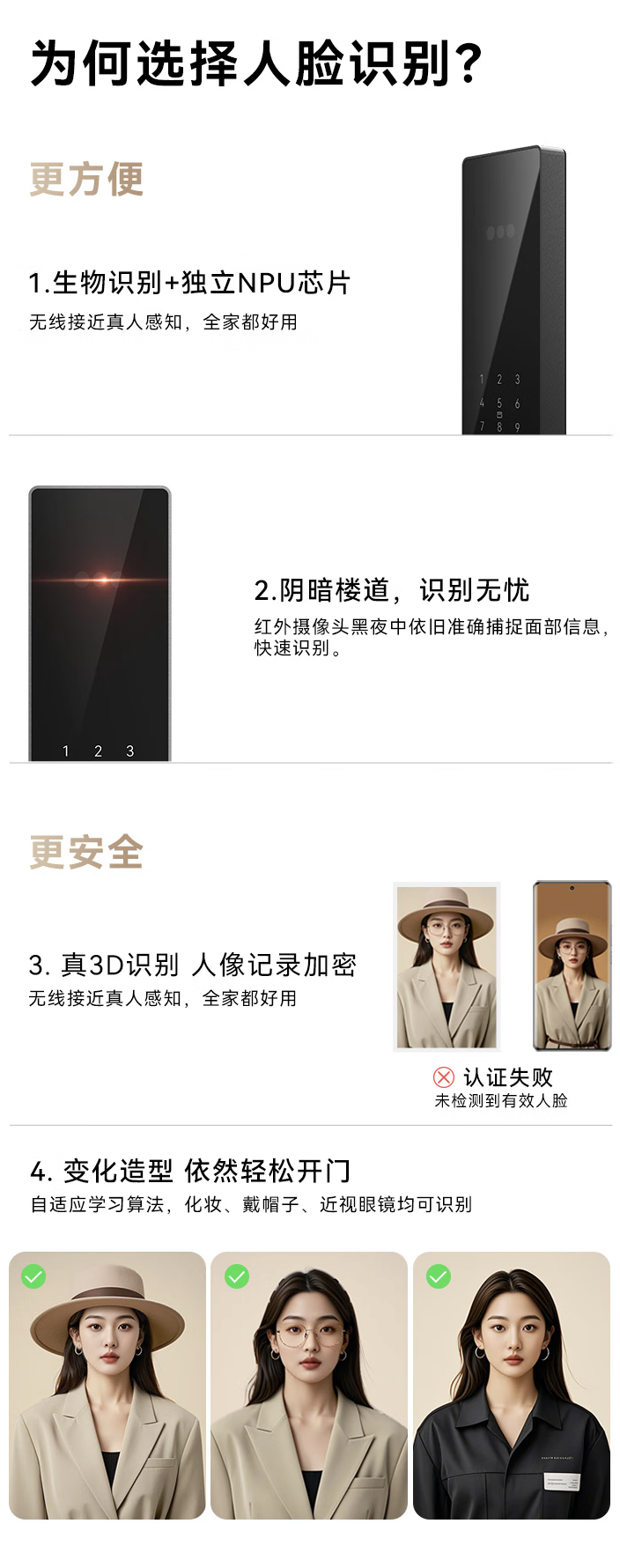 官方介绍称,这款门锁配备独立人脸识别处理器,支持“真 3D 识别”,门锁同时还支持 App 解锁、指纹解锁、密码解锁、卡片解锁、传统钥匙解锁。