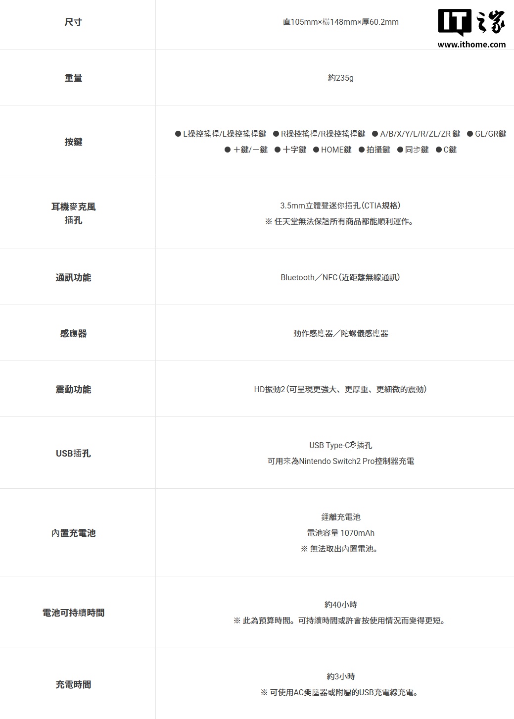 现在,任天堂中国香港官网公布了这款手柄的完整规格。2 代手柄重量约 235g,比初代减轻了 11 克。虽然电池容量从 1300mAh 缩减至 1070mAh,但续航时间仍为约 40 小时。与此同时,新手柄的充电时间也缩短了一半,从原来的 6 小时缩减到了 3 小时。