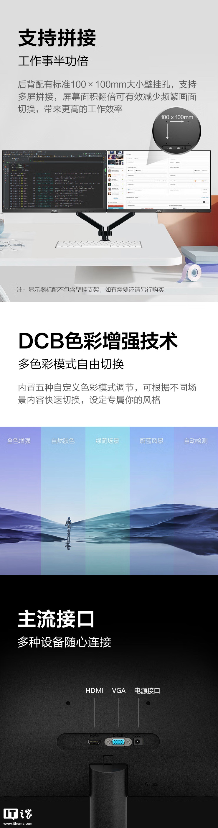 该显示器支架支持倾斜,支持 VESA 100x100mm 壁挂,提供 HDMI 和 VGA 接口。