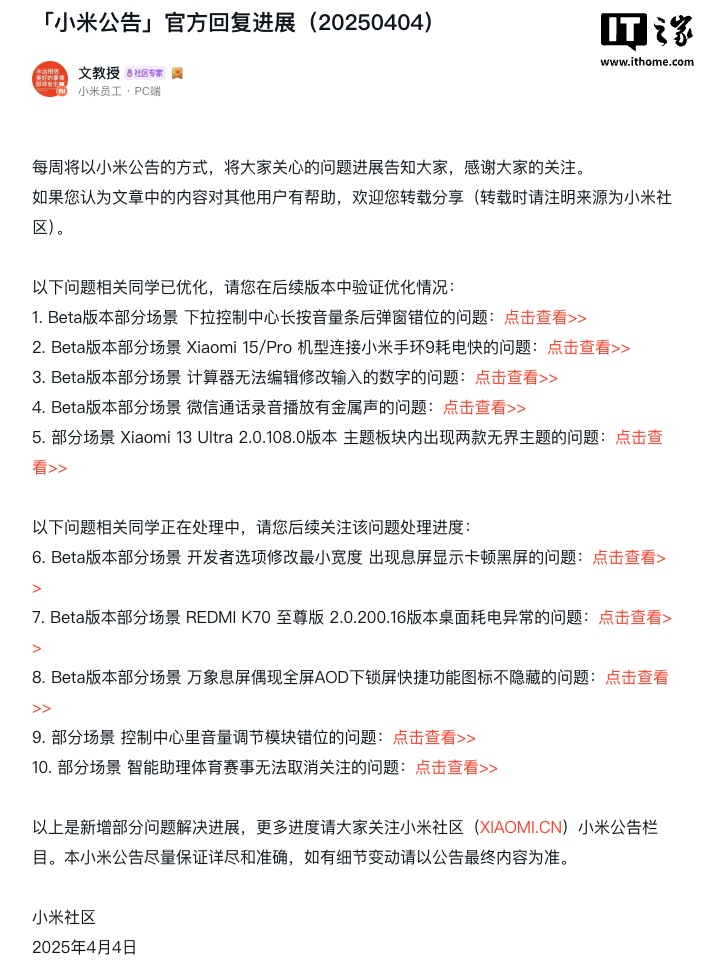 IT之家 4 月 6 日消息,小米官方本周(4 月 4 日)在小米社区发布公告,对小米澎湃 OS 问题处理进展进行公布,其中提到了小米 15 / Pro、13 Ultra 机型的体验问题优化情况。
