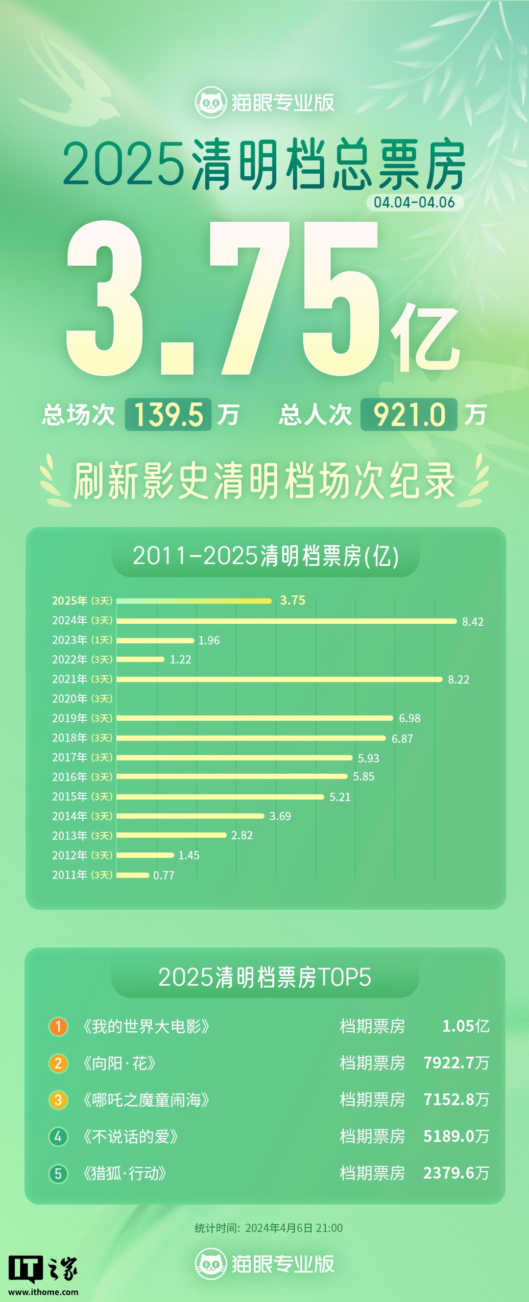 IT之家注意到,截至 4 月 6 日 21 时,2025 清明档总票房 3.75 亿、总人次 921.0 万、总场次 139.5 万,刷新中国影史清明档场次纪录。清明档票房 TOP5 如下: