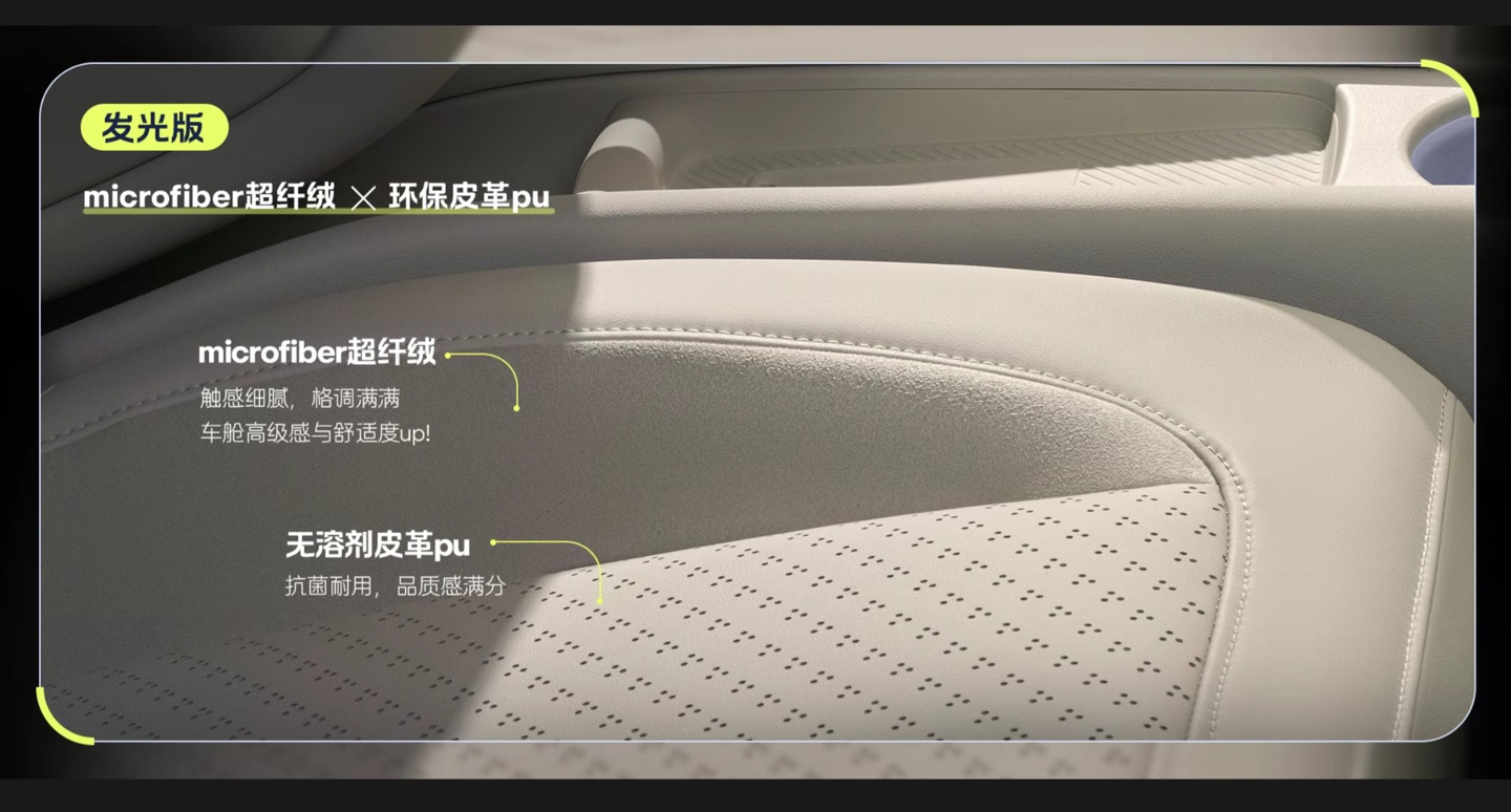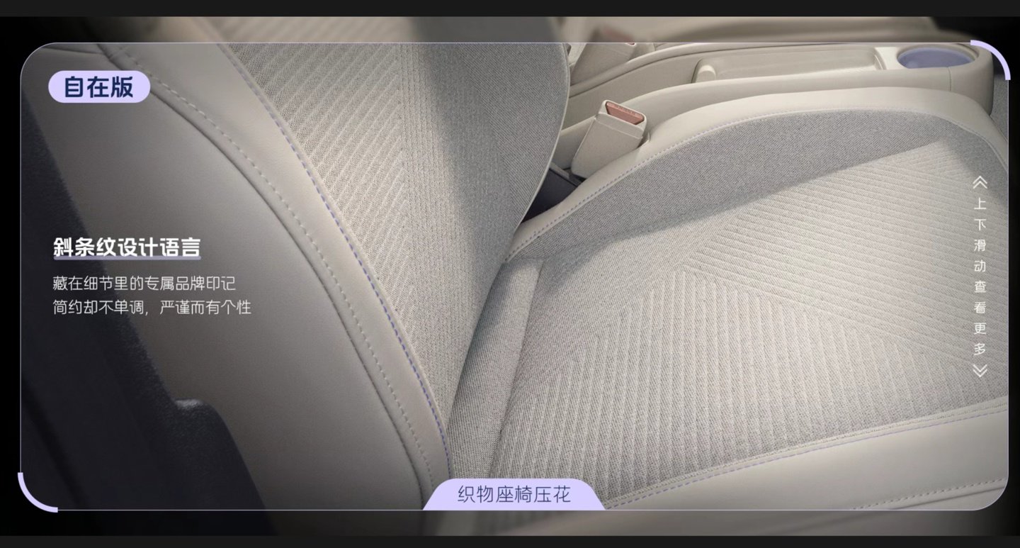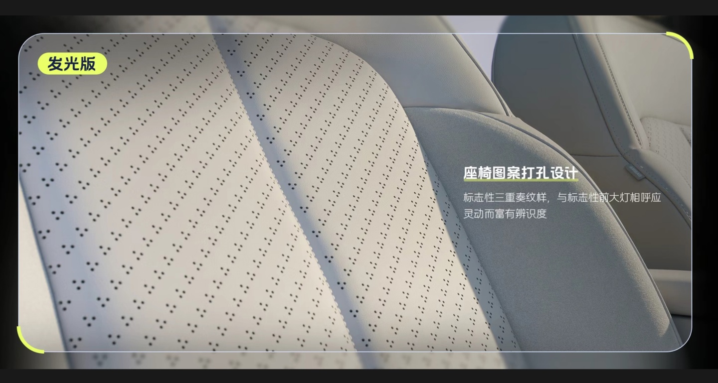 据官方介绍,自在版内饰采用可再生织物搭配环保皮革 pu 材质,斜条纹设计语言;发光版采用 microfiber 超纤绒搭配环保皮革 pu 材质,座椅采用图案打孔设计。