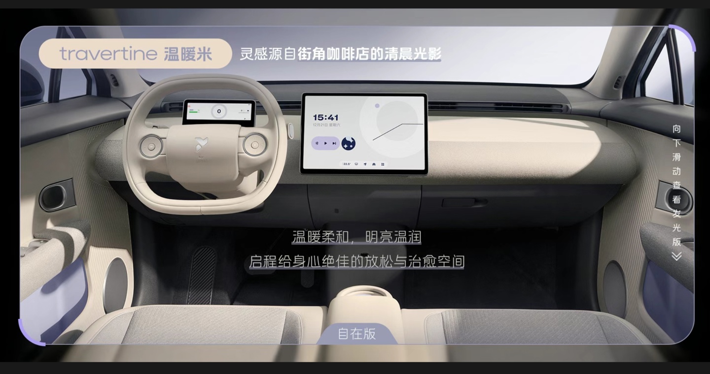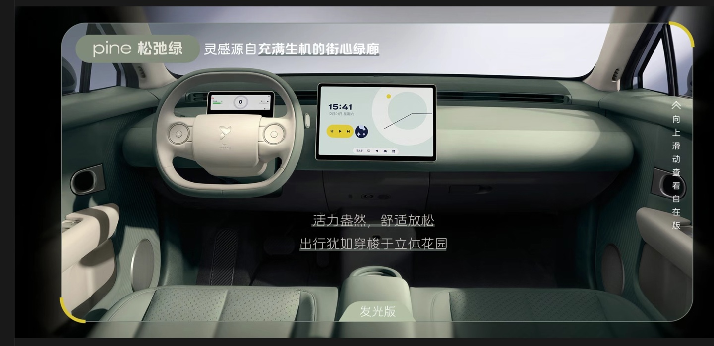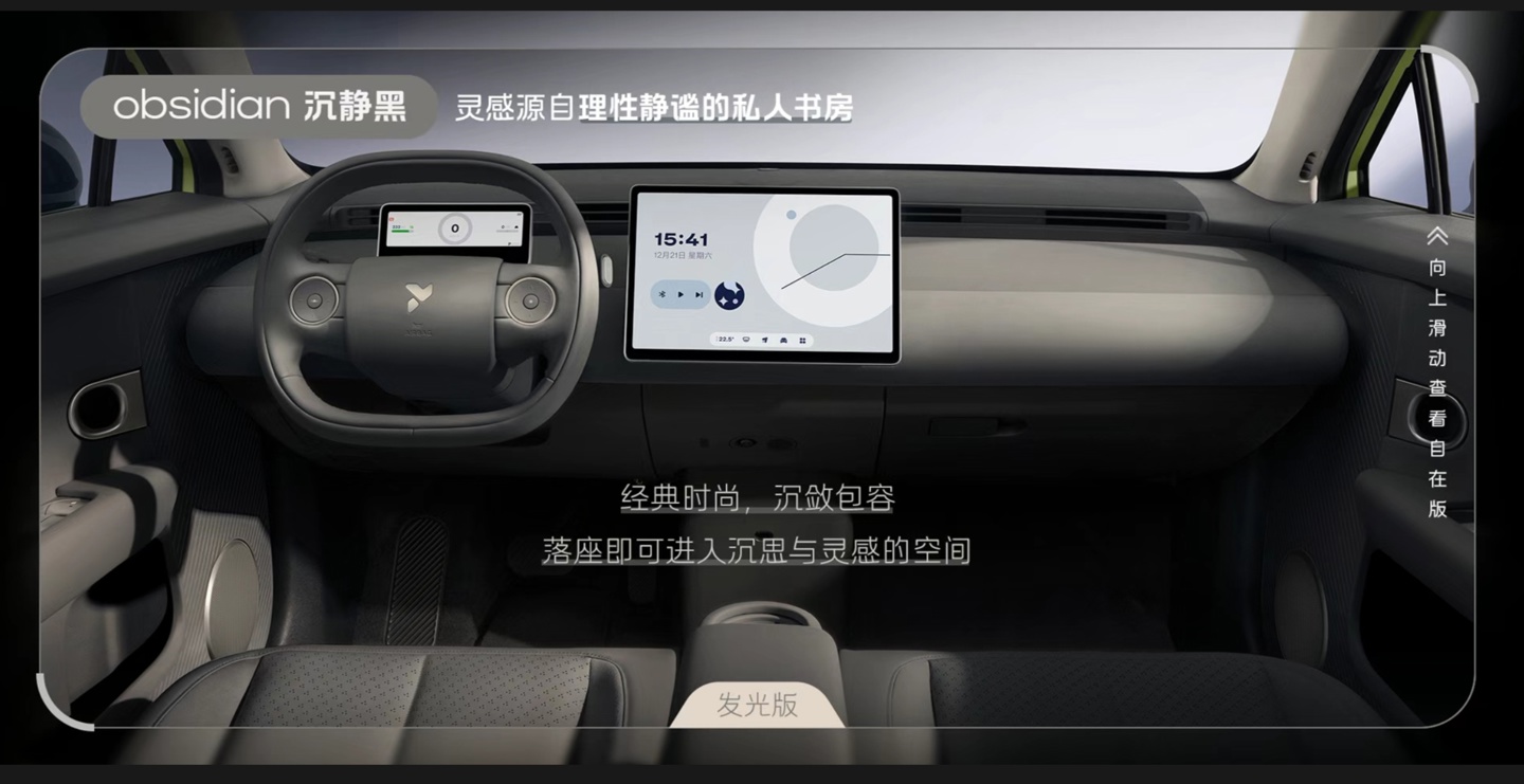 据官方介绍,自在版内饰采用可再生织物搭配环保皮革 pu 材质,斜条纹设计语言;发光版采用 microfiber 超纤绒搭配环保皮革 pu 材质,座椅采用图案打孔设计。