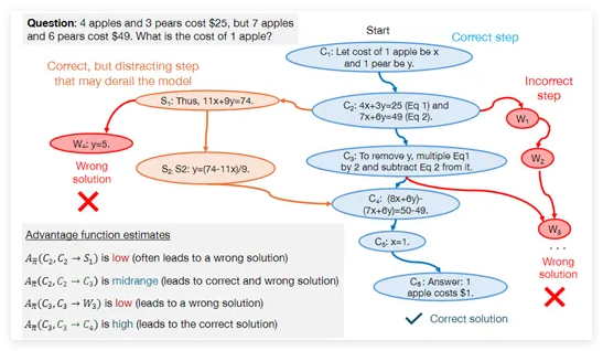 DPO 方法为每个问题解决步骤分配一个优势值,反映其相对于理想解决方案的价值。研究表明,高优势步骤是正确解决方案的关键,而低优势步骤可能表明模型推理中存在问题。利用这些优势值,模型可以在强化学习框架内动态调整其策略,从而更高效地从合成数据中学习和改进。