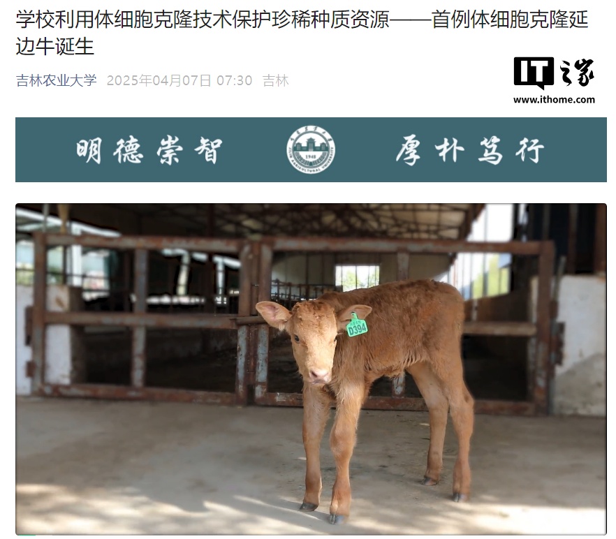 IT之家 4 月 7 日消息,吉林农业大学今日官宣,该校在安徽亳州(bó zhōu)成功培育出 2 头体细胞克隆延边牛。延边牛作为我国五大地方良种之一,以肉质卓越著称。克隆技术的成功应用,可快速复制顶级种牛基因。