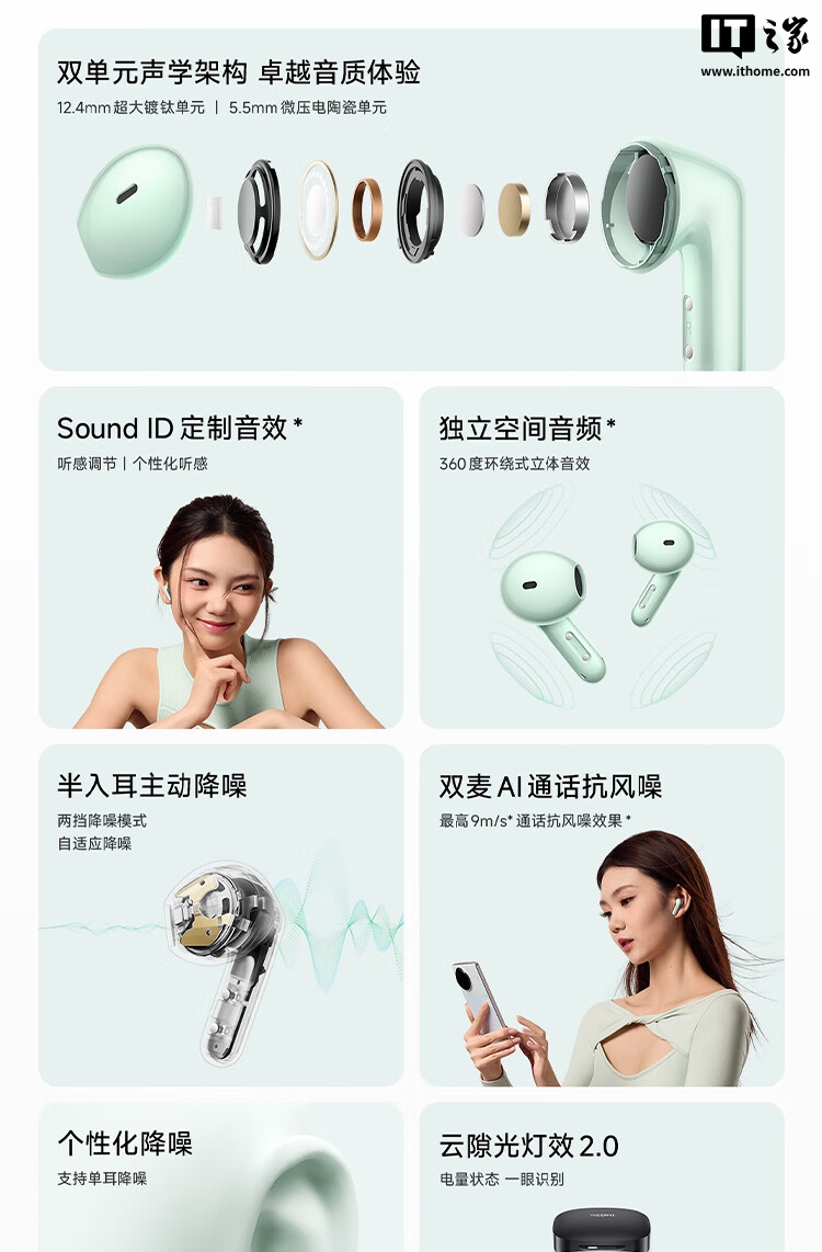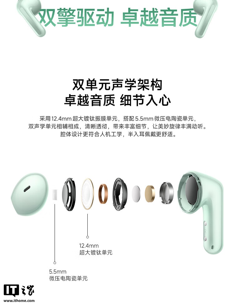 REDMI Buds 7S 采用了双单元声学架构,配备 12.4mm 超大镀钛单元和 5.5mm 微压电陶瓷单元,提供清晰透彻的音质和丰富的细节。耳机还支持五档 EQ 音效调节,用户可以根据自己的喜好自定义音效,享受个性化的听觉体验。此外,REDMI Buds 7S 还获得了网易云音乐硬件设备认证。