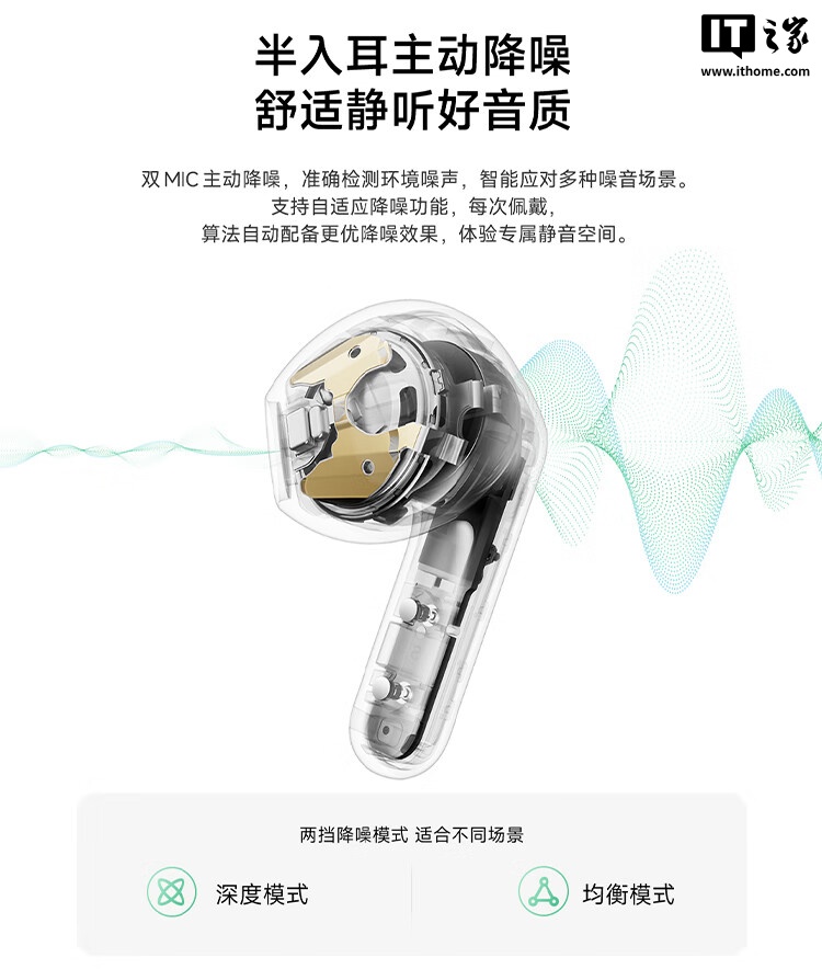 REDMI Buds 7S 支持半入耳主动降噪,采用双 MIC 主动降噪技术,能够准确检测环境噪声并智能应对多种噪音场景。耳机支持两档降噪模式:深度模式和均衡模式,用户可以根据不同的使用场景选择合适的降噪模式。此外,REDMI Buds 7S 还支持个性化降噪,通过算法智能检测用户佩戴情况,自动调整降噪参数,提供量身定制的降噪体验。