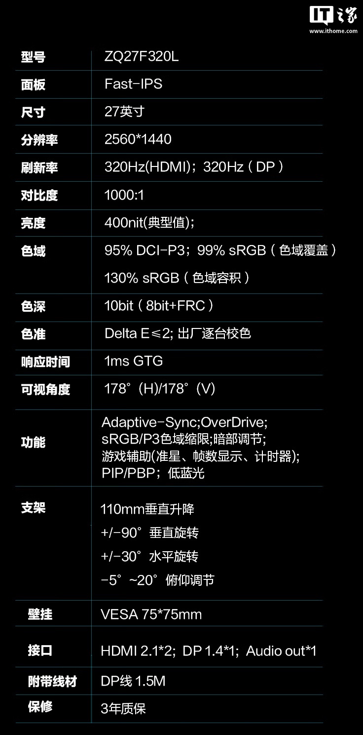 IT之家附显示器参数信息如下: