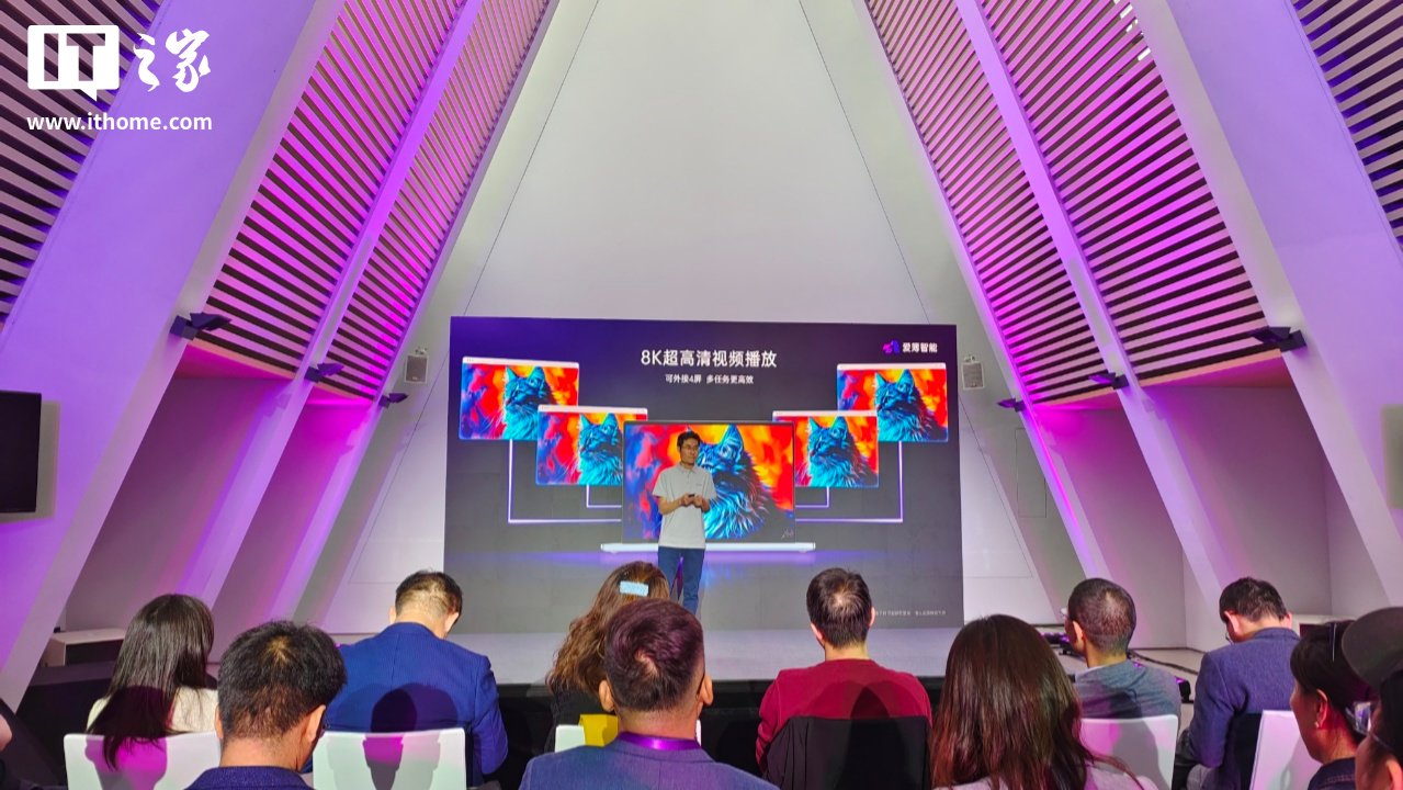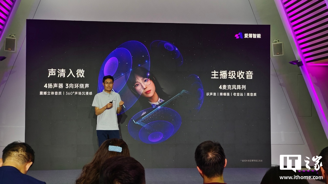 IT之家从发布会获悉,爱簿智能 AI BOOK 算力本配有 4 扬声器、4 麦克风阵列,重量约 1.35kg,厚度约 12.4mm,搭载 2.8K 120Hz OLED 屏。
