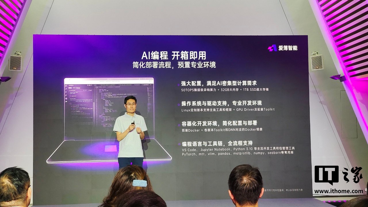 AI BOOK 算力本号称可以解决 AI 部署开发环境流程繁琐、系统导致性能损耗等问题,内置 50TOPS 算力、32GB 内存 + 1TB 存储,并预装 Docker、支持各种编程工具,号称可以 AI 编程开箱即用。