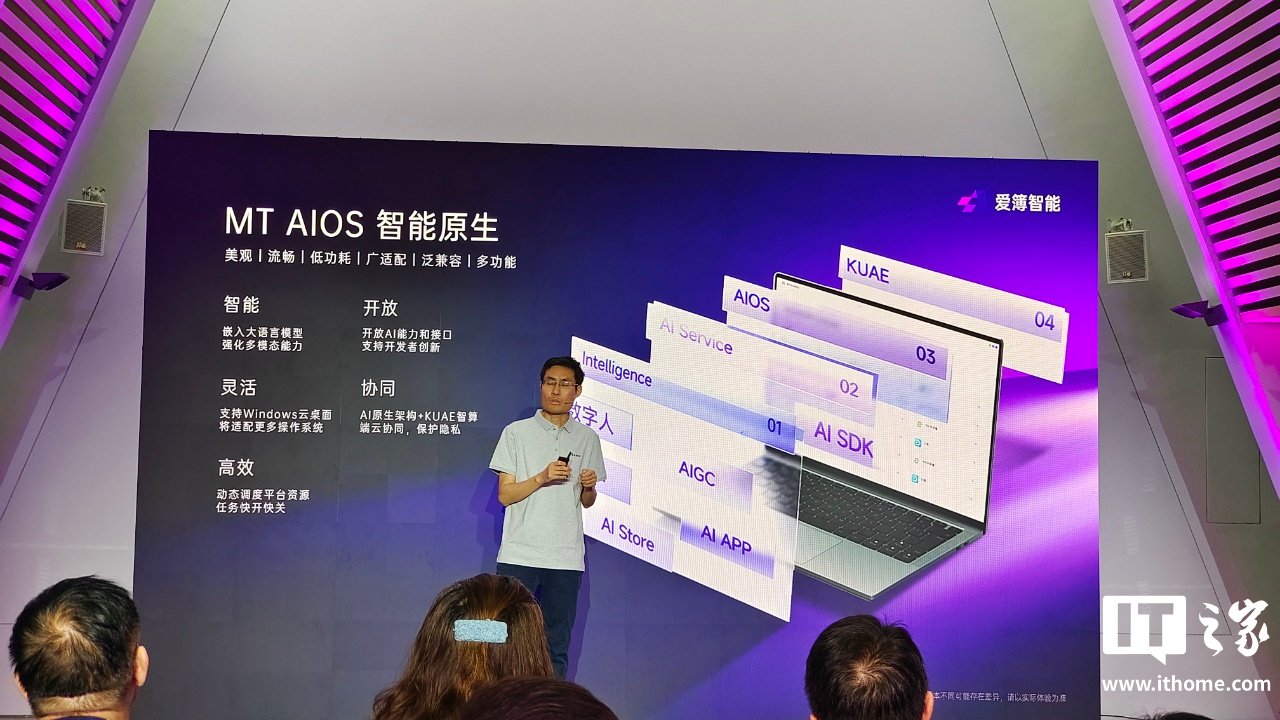 AI BOOK 算力本支持主流开源大模型,端侧最高支持 32B 大语言模型;配有 AB100 全大核 64 位平台,运行基于 Linux 内核的 MT AIOS 操作系统。