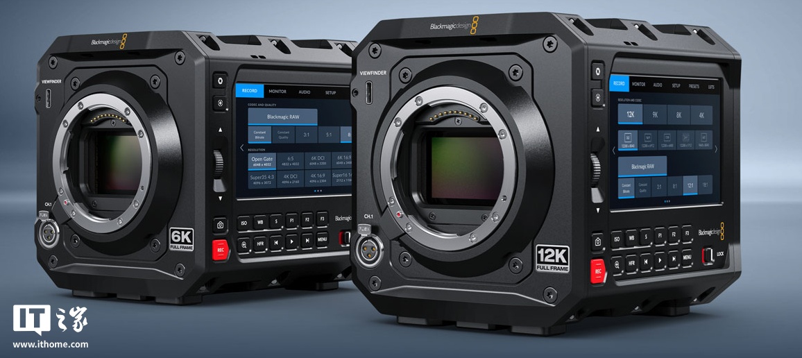 在拍摄参数方面,该系列电影机均支持 Blackmagic RAW 格式录制,6K 型号原生 ISO 为 400,高基准 ISO 为 3200;12K 型号拥有 200 到 3200 的 ISO,并针对 800 进行了优化;且 12K 型号可最高在 12K Open Gate 3:2 模式下拍摄 40fps 帧率的视频(IT之家备注:Open Gate 模式通常称为“片门全开”模式,即为使用整块 CMOS 传感器进行录制,可方便后期裁切成不同比例的视频),6K 型号在该模式下可拍摄 36fps 帧率的视频。