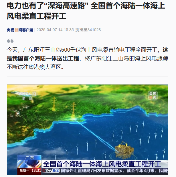 IT之家 4 月 7 日消息,据央视新闻报道,广东阳江三山岛 500 千伏海上风电柔直输电工程今日全面开工,这是我国首个海陆一体送出工程,将广东阳江三山岛的海上风电源源不断送往粤港澳大湾区。