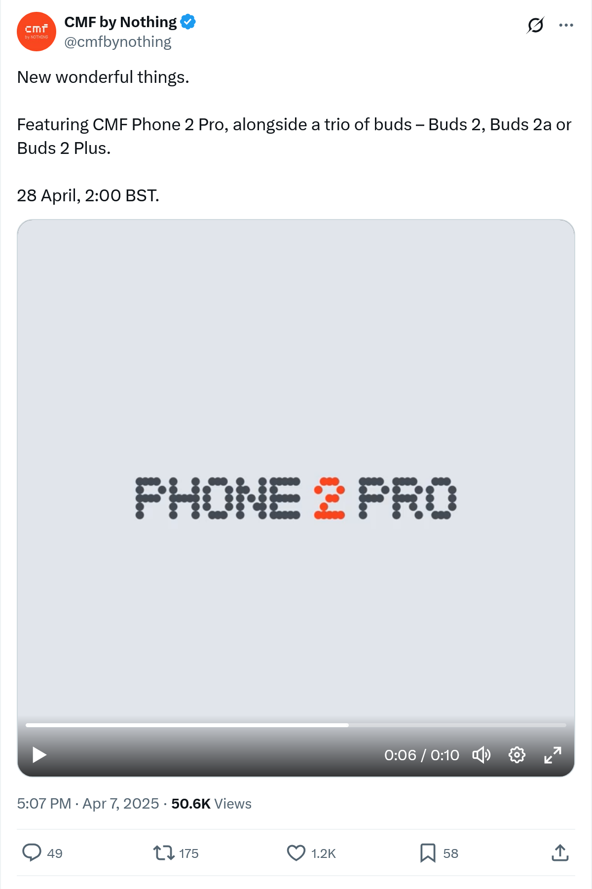 IT之家 4 月 8 日消息,Nothing 旗下子品牌 CMF 北京时间昨日宣布将于 BST 时间本月 28 日 2:00(IT之家注:北京时间 28 日 9:00)发布四款新硬件,包括 CMF Phone 2 Pro 智能手机和 CMF Buds 2 / 2a / 2 Plus 三款耳机。