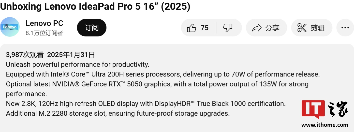 ▲ 相关内容摘录而联想 PC 官方油管账号则在 1 月 31 日的 Lenovo IdeaPad Pro 5 16"(IT之家注:大致对应国内小新 Pro 16 GT)笔记本电脑开箱视频的简介中表示该机型可选配 RTX 5050 显卡。