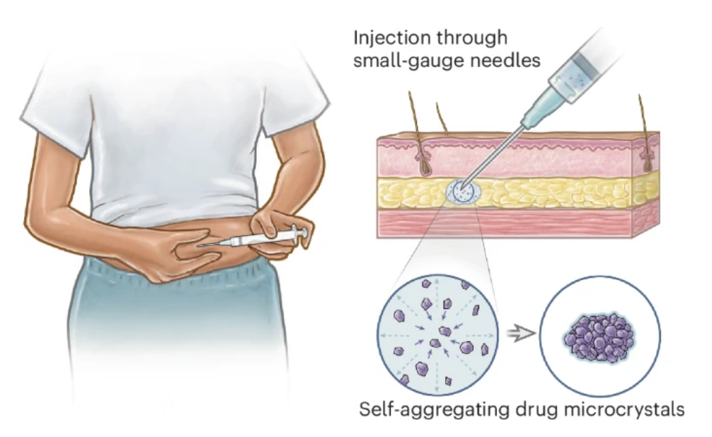 通过将药物制成微小晶体悬浮液并注射到皮下,这些晶体会在体内自动组装成一个“药物仓库”,能够持续数月甚至数年缓慢释放药物。