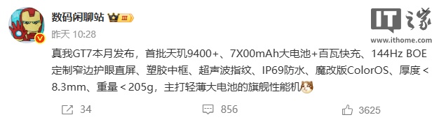 据博主 @数码闲聊站 此前爆料,这款新机首批搭载天玑 9400+ 处理器、内置“7X00mAh 电池”(容量超 7000mAh)、配备 144Hz BOE 定制窄边护眼直屏。