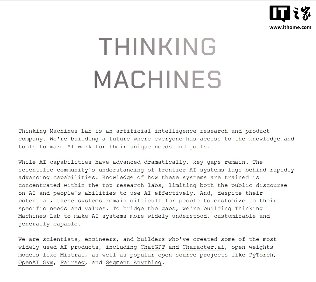 思维机器实验室目前对其研究方向和产品规划保持低调。该公司曾在 2 月透露,未来将致力于开发能够“更好地满足人们独特需求和目标”的 AI 工具,并创造更加易于理解、可定制且功能更强大的 AI 系统。