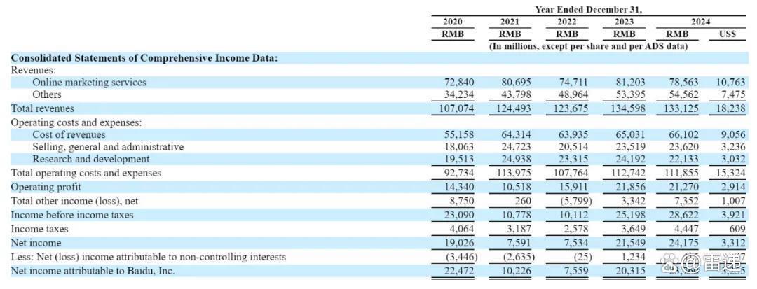 百度 2020 年、2021 年、2022 年、2023 年、2024 年净利分别为 190.26 亿元、75.91 亿、75.34 亿、215.49 亿元、241.75 亿元。