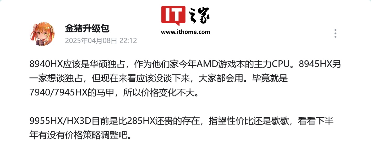 IT之家注意到,@金猪升级包 在昨日进一步称锐龙 9 8940HX 这一 SKU 应该是华硕品牌独占: