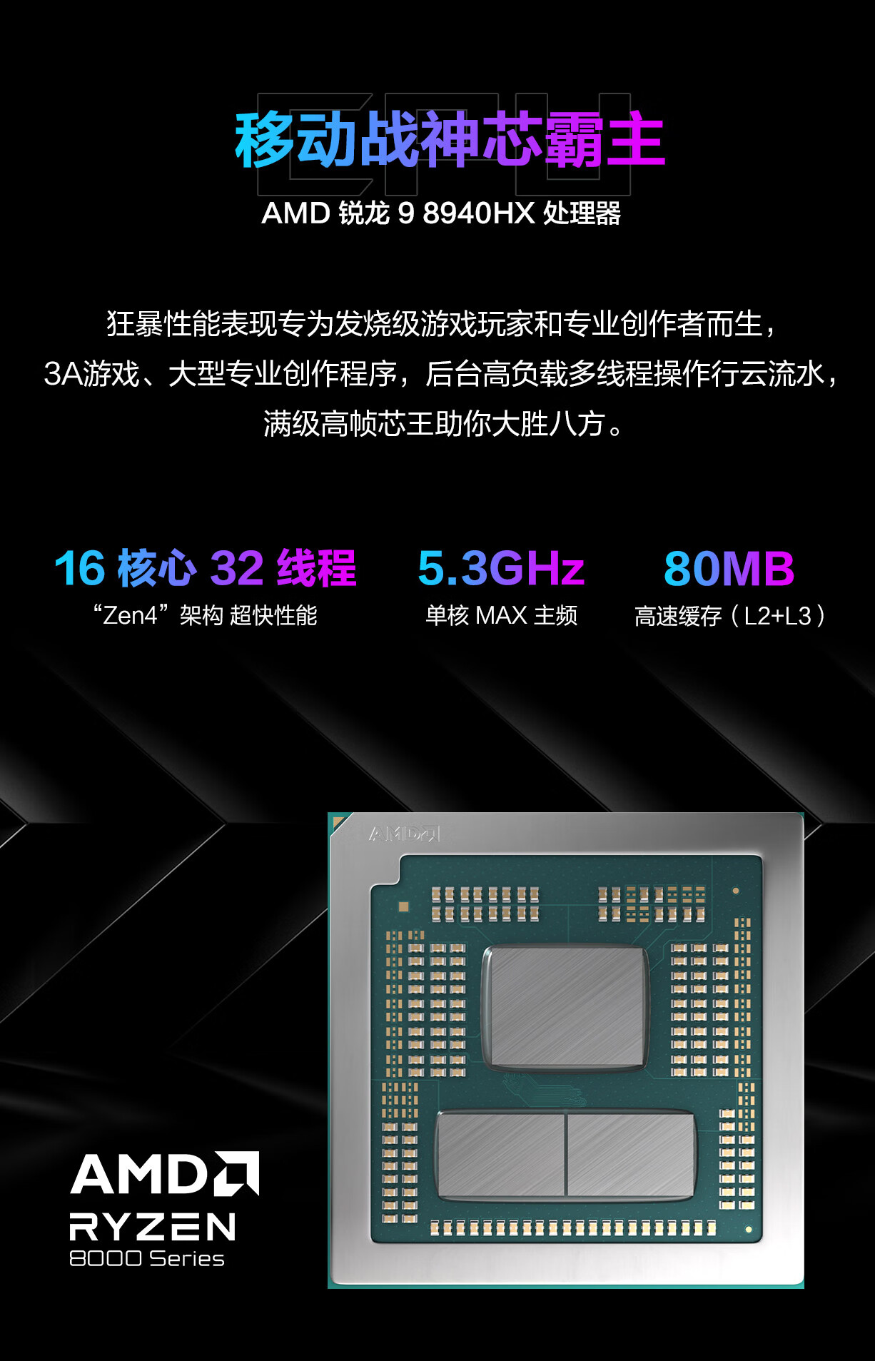华硕官方表示锐龙 9 8940HX 采用 "Zen 4" 微架构和 5nm 工艺,拥有 16 核心 32 线程,L2、L3 三级缓存合计 80MB,最高加速频率可达 5.3GHz。