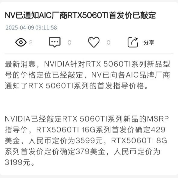 IT之家 4 月 9 日消息,博板堂方面今日表示,英伟达已向各大 AIC 合作伙伴通知了即将于下周发售的 GeForce RTX 5060 Ti 系列显卡的指导价格。