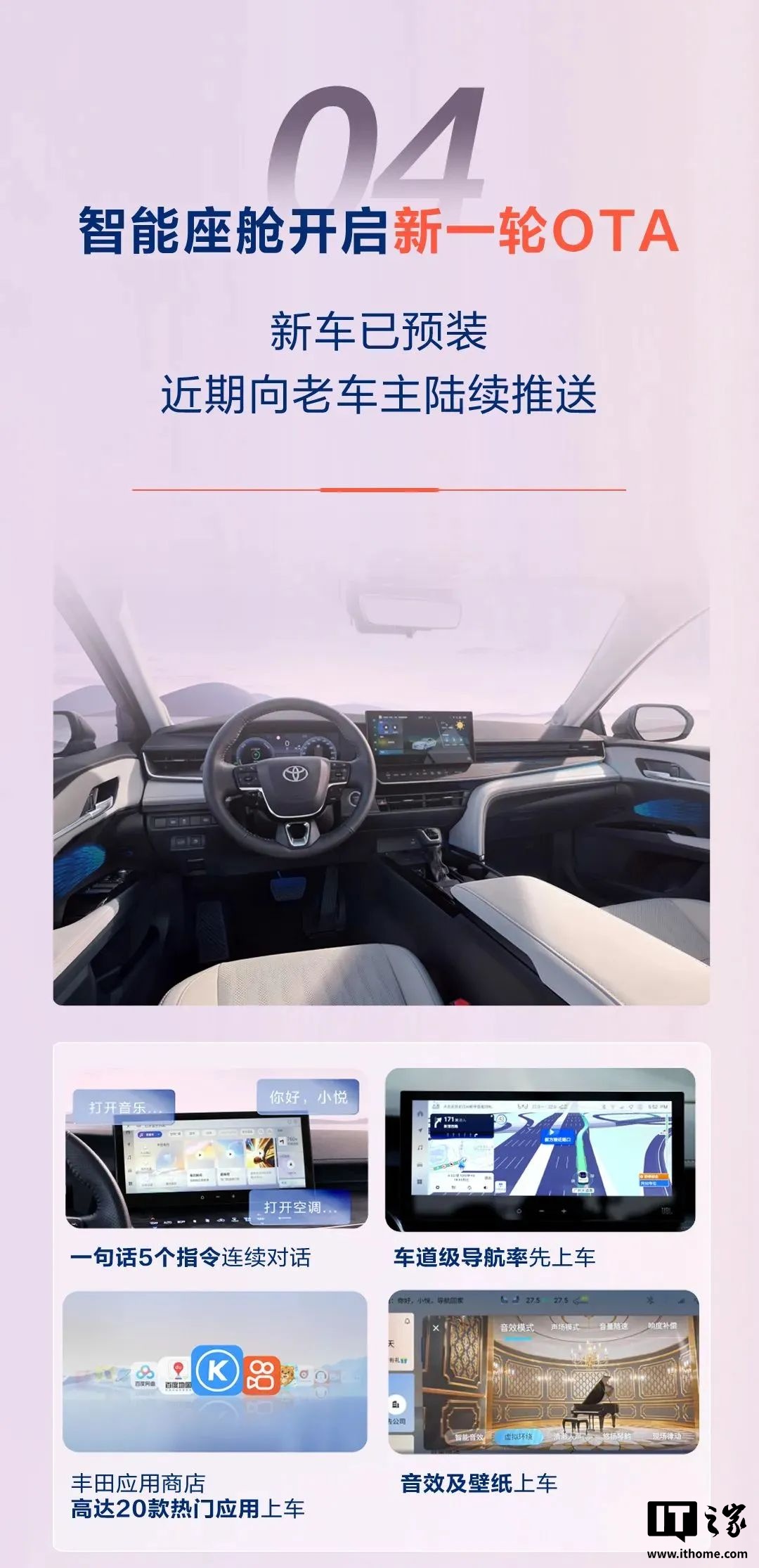 IT之家从广汽丰田官方获悉,其智能座舱已开启新一轮 OTA,其中新车已预装,近期会向老车主陆续推送。座舱新版本新增一句话 5 个指令连续对话、车道级导航、20 款热门应用、新音效及壁纸。另外凯美瑞将保持每年约 2 次 OTA 升级频率,采用双面冗余机制,支持随时边开车边升级,无需停车等待、无需预约(老车主 OTA 备案审批中,通过后即可推送升级)。
