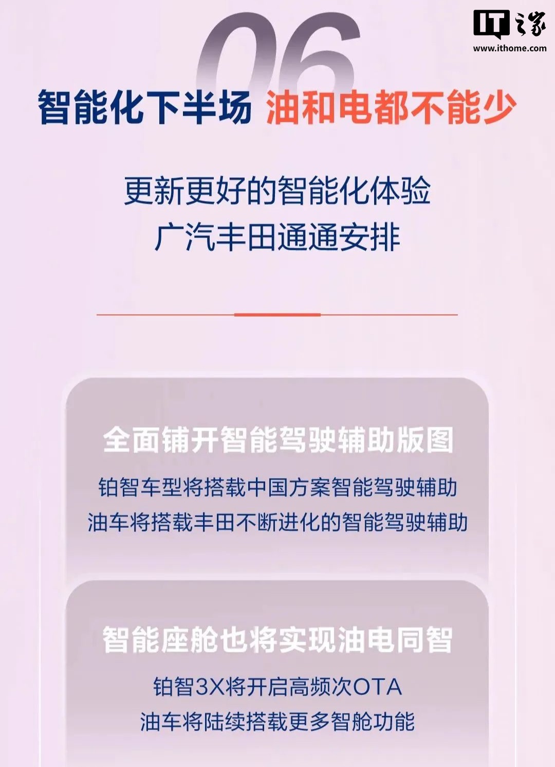此外,广汽丰田将升级汽车智能化体验,全面铺开智能驾驶辅助版图,其中铂智车型将搭载中国方案智能驾驶辅助、油车将搭载丰田的智能驾驶辅助;智能座舱也将实现油电同智:铂智 3X 将开启高频次 OTA、油车将陆续搭载更多智舱功能。