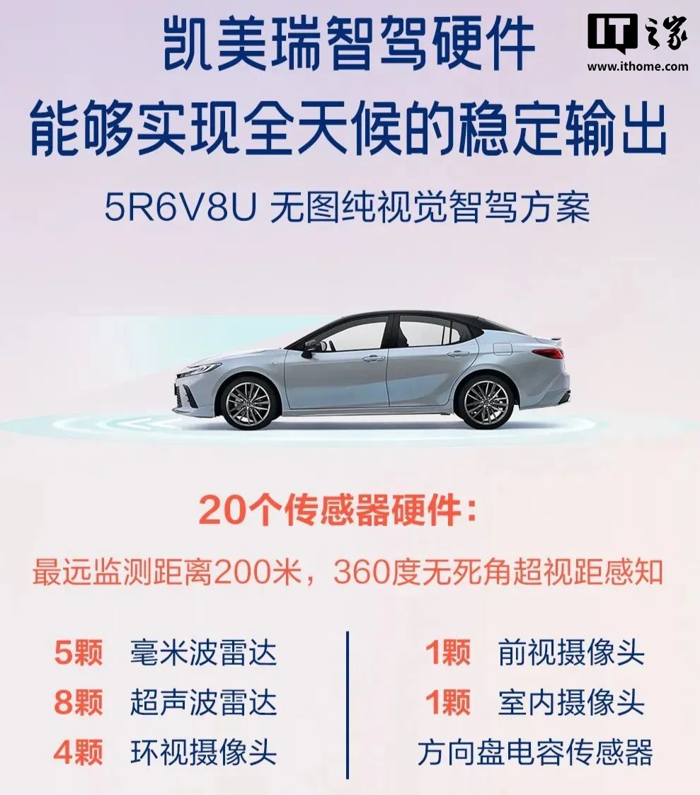 凯美瑞智驾版全系配备 TSS 3.0PRO 系统,升级 5R6V8U 的无图纯视觉智驾方案,含 20 个传感器硬件:5 颗毫米波雷达、8 颗超声波雷达、4 颗环视摄像头、1 颗前视摄像头、1 颗室内摄像头 + 方向盘传感器。新车最远监测距离为 200 米,可实现 360 度无死角超视距感知,支持 LCA 变道辅助、DMC 驾驶员状态监测、FCTA 前方交通穿行警示、面容 ID 识别、透明底盘、PVM 全景监控、数字钥匙等功能。