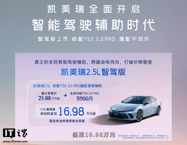 IT之家 4 月 9 日消息,广汽丰田凯美瑞轿车“智驾版”今日正式上市,新车号称“增配不加价”,标配 TSS 3.0 PRO 智能驾驶辅助,建议零售价 21.98 万元起、2.5L 智驾版综合权益后 16.98 万元起(综合权益包含厂家权益 3.2 万、厂家置换补贴 0.5 万、国补最高 1.3 万,活动有效期为即日起至 2025 年 6 月 30 日)。