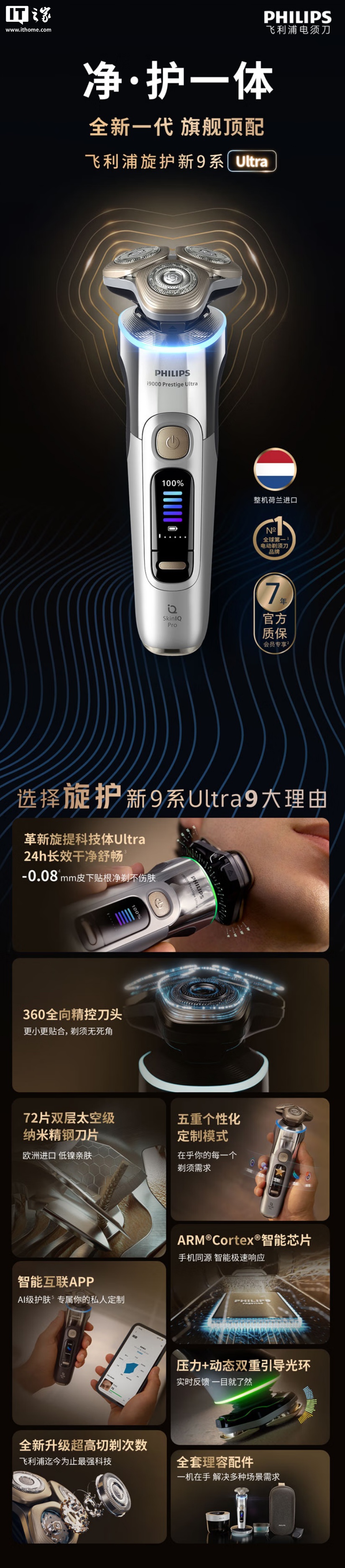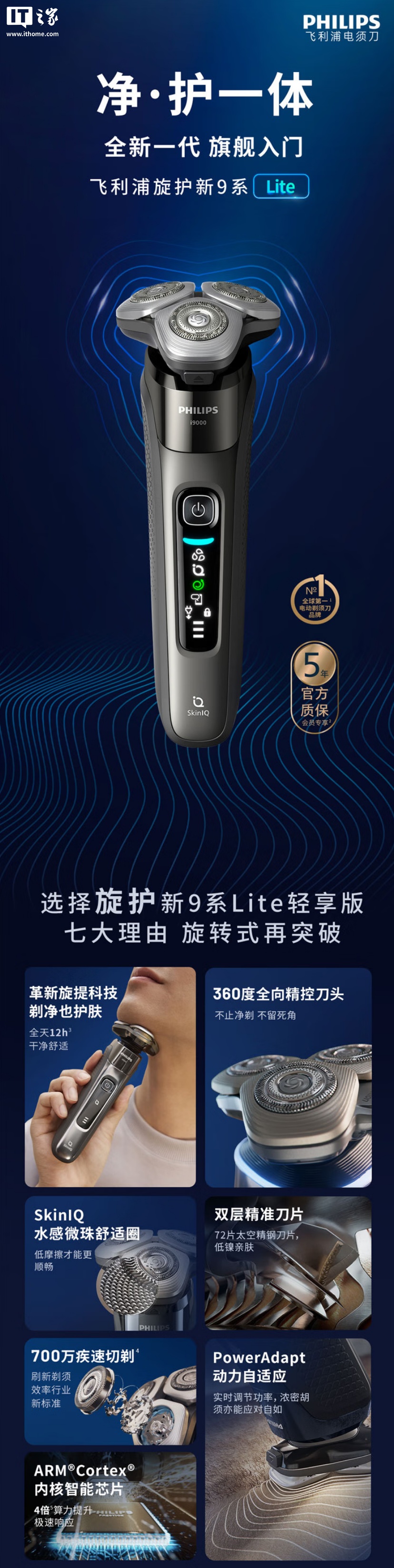 新 9 系 Lite:配有 360 度全向精控刀头、SkinIQ 水感微珠舒适圈、双层刀片,支持动力自适应、IPX7 防尘防水,售价 1699 元