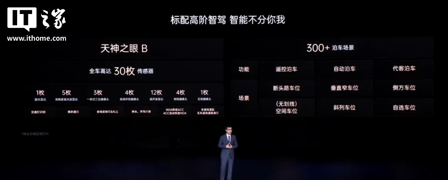 该车标配天神之眼 B 高阶智驾,全车拥有最高 30 枚传感器,支持 300+ 泊车场景,标配激光雷达;以及 DiLink 150 智能座舱高阶版。