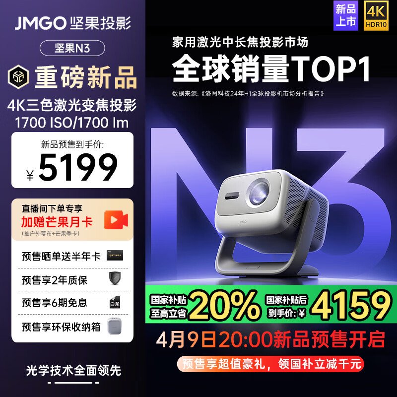 IT之家 4 月 9 日消息,坚果投影今日推出了一款“坚果 N3 三色激光变焦投影仪”,首发价 5199 元,叠加补贴后 4159 元。
