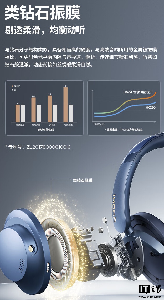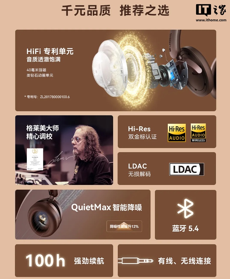 据介绍,这款耳机除本次发布的限定色外,还可选黑 / 蓝双色,耳机采用亲肤蛋白皮耳罩,整机重量 246 克,其配备 40mm“类钻石专利”动圈单元,号称“具备钻石的硬度、传递声音干净利落”,能够改进听感,同时拥有“双金标认证”。