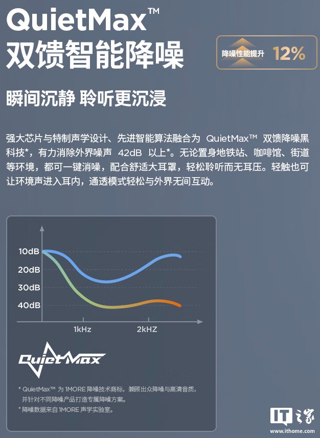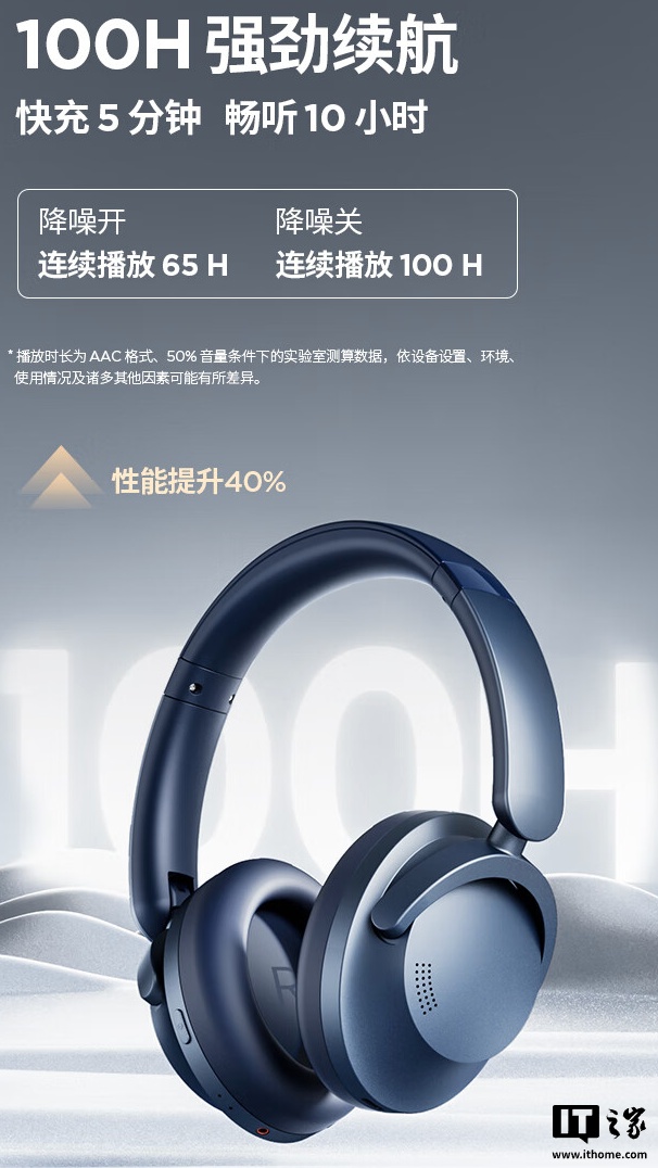 此外,该机搭载“QuietMax”双馈主动降噪技术,号称可以消除外界噪声 42 dB 以上,同时支持 AI 通话降噪;耳机配备 720 毫安时电池,在关闭降噪的情况下续航至高 100 小时,同时支持快充技术,可实现“充电 5 分钟,畅听 10 小时”。