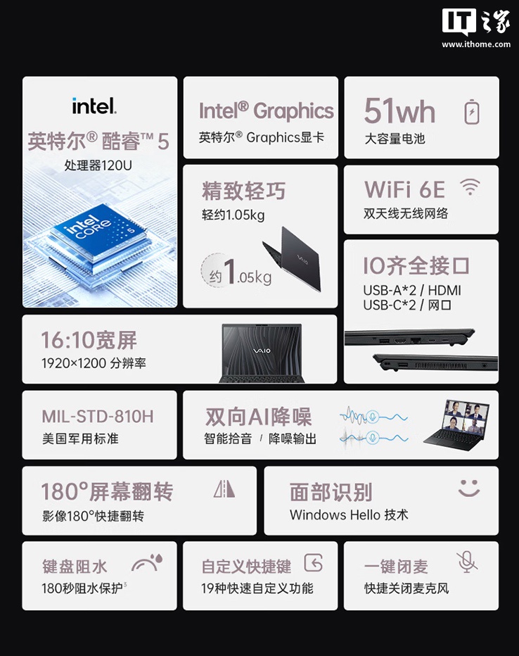 该机配备一块 13.3 英寸 1920x1200 分辨率 60Hz 面板,配备 92 万像素前置摄像头(提供物理摄像头隐私开关),官方强调该机全新升级“VAIO 视频会议控制”软件,配备 AI 降噪麦克风,4 种模式可选,一键切换。