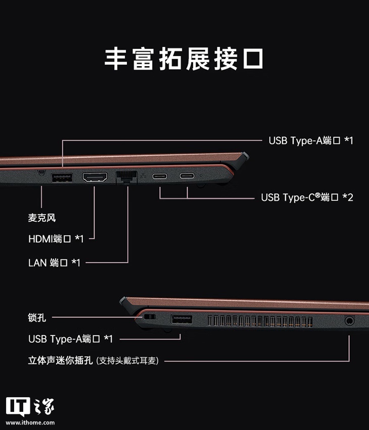 I/O 方面,该机左侧配备 1 个 USB-A 接口、1 个 3.5mm 音频接口;右侧配别 1 个 USB-A 接口、1 个 HDMI 接口、1 个 RJ45 网口、2 个 USB-C 接口。