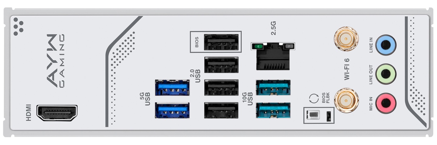 后置接口:1× HDMI 2.1 TMDS、2× USB-A 5Gbps、4× USB-A 480Mbps、2× USB-A 10Gbps、1× 2.5GbE RJ45、一对 Wi-Fi 天线插孔、3× 音频插孔。